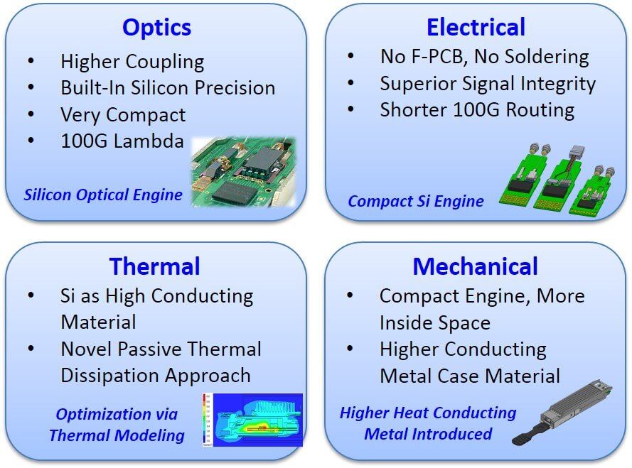 The sophisticated O/E engine platform revolutionizes the industry in two aspects : the miniatuation in size and the ease of manufacturing versus the tradidtional optical assemblies. This platform has been demonstrated that can support optical interconnect roadmap from 100G, 200G, 400G and beyond.