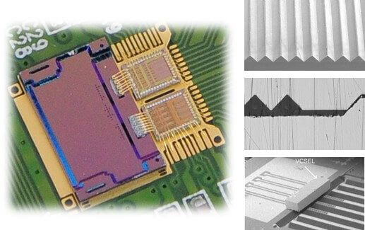 The optical engine from system design phase will be processed in a semiconductor foundry fab. The process monolithically builds highly integrated optical elements and electrical circuits on silicon wafers with high precision at competitive cost.